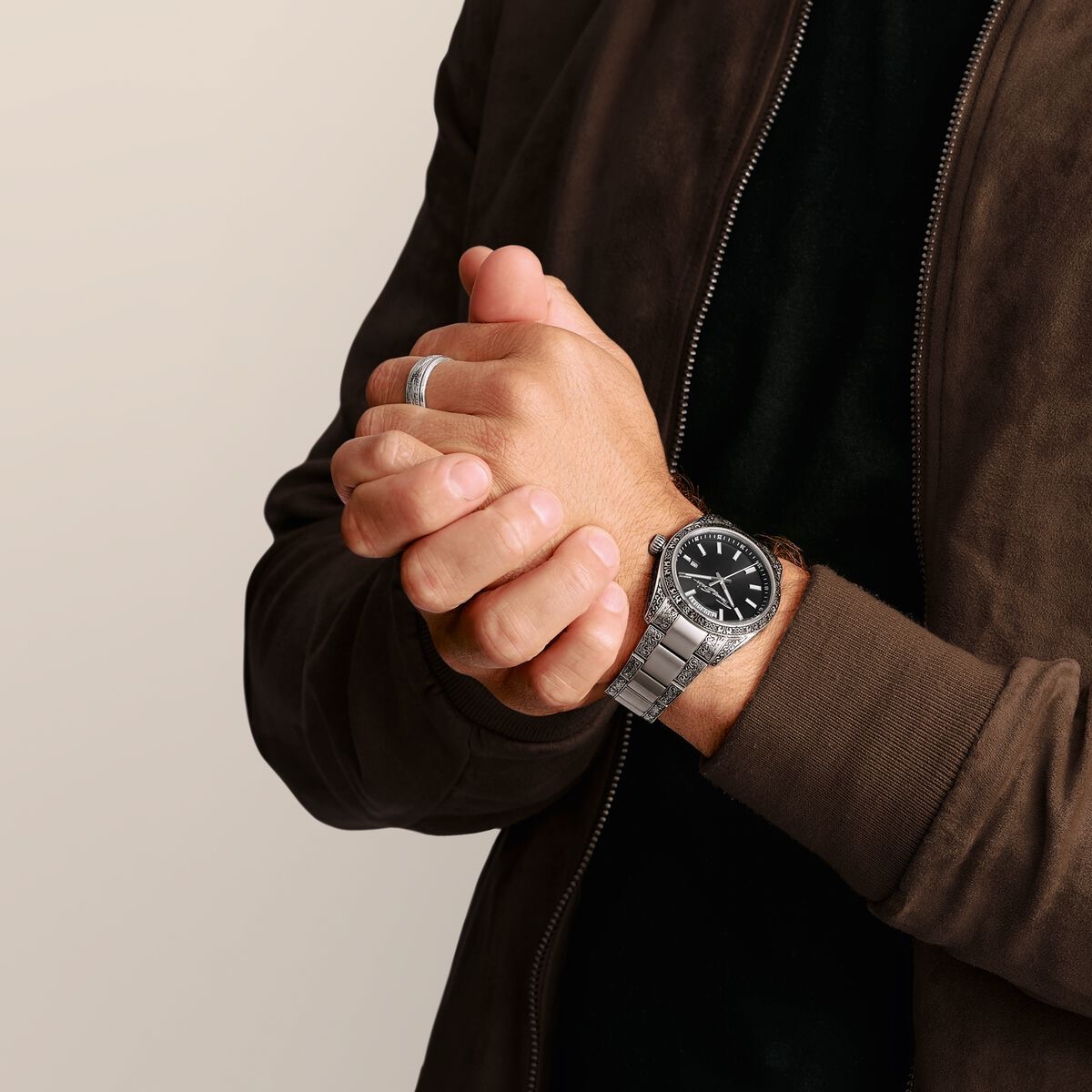 Precioso reloj de acero inoxidable con grabados tanto en la caja, bisel y brazalete con un elegante color azul medianoche simulando los rayos del sol